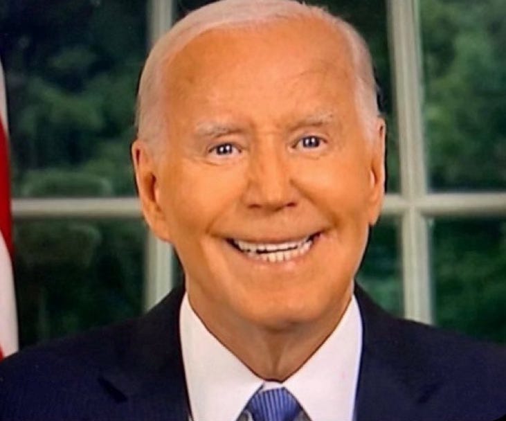 This creepy picture of Joe Biden that Perla likes to send me after I tell her “We did it Joe” The emotion this meme is meant to evoke is, “I did it but at what cost.” Sometimes she sends it to me in a whole other context and I understand that she means to evoke the feeling of “cope” a term that Gen Alpha is using that Perla learned from her niece and taught to me.